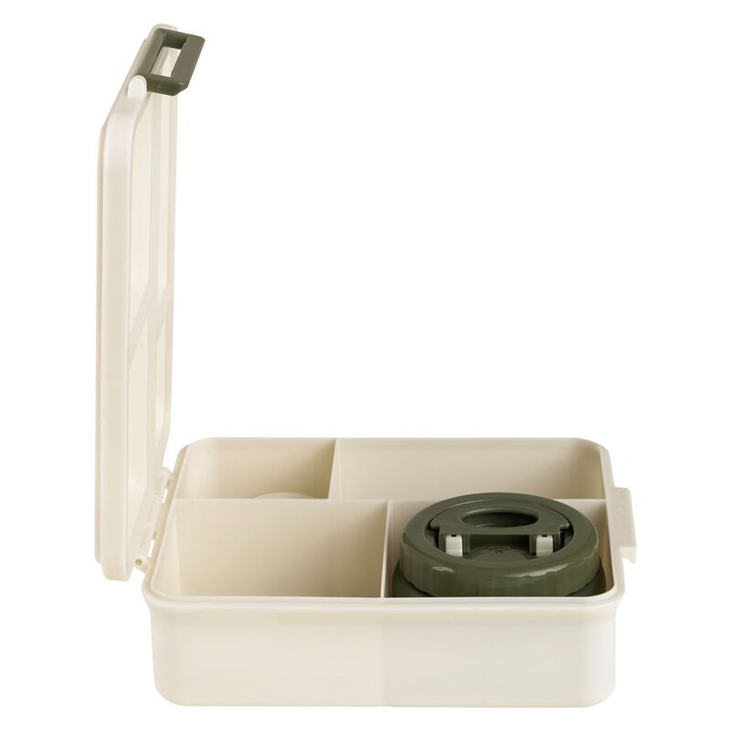 - Stores food in 4 separate compartments, in bento lunchbox style.