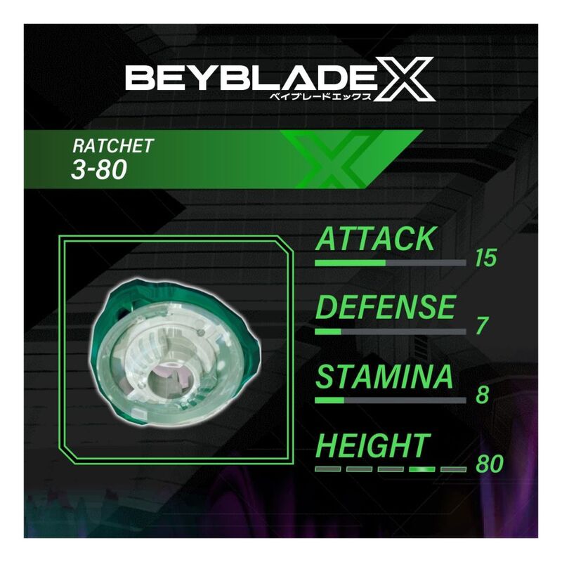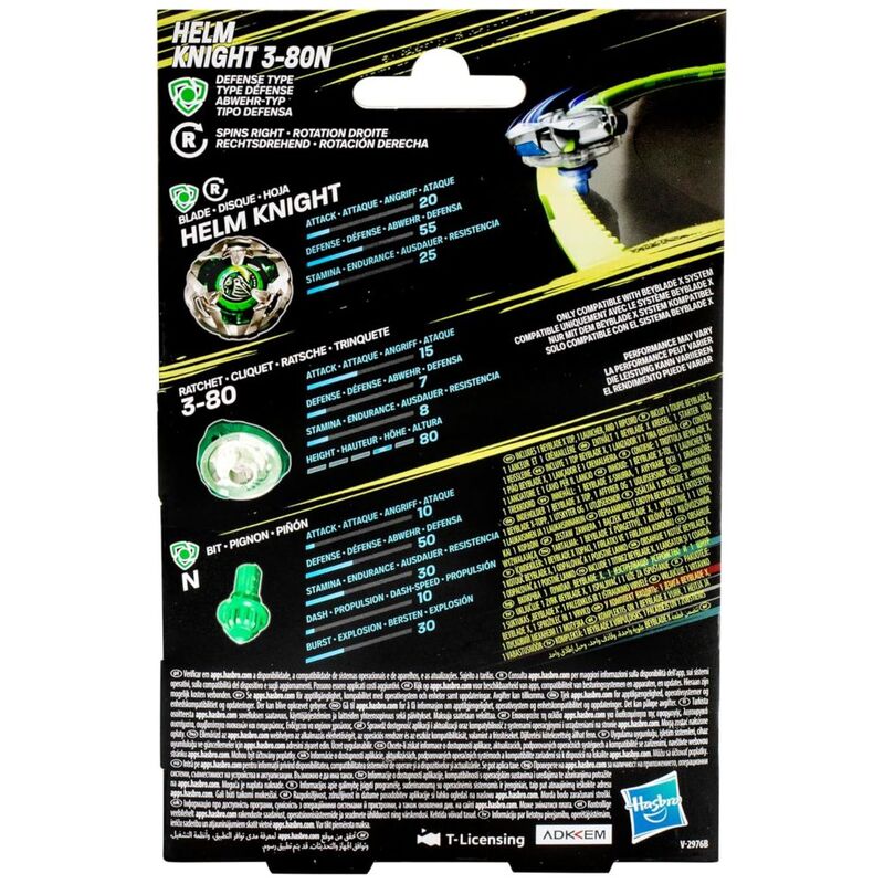 Customizable and battle-ready, Helm Knight 3-80N has an interchangeable blade, ratchet, and bit. Twist and click each piece to optimize your Defense Type strategy, and mix and match with other Beyblade X tops for added versatility.