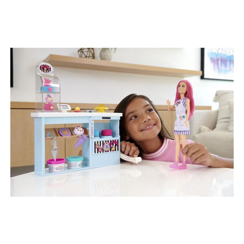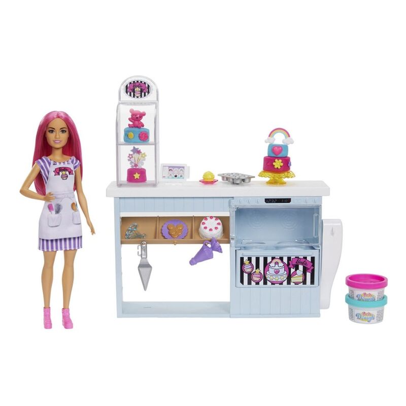 - The playset includes a bakery station, Barbie® 12-inch doll, 2 dough containers, piping bag stamper, spatula, decorations, toppers, cupcake tin, cookie plate and more.