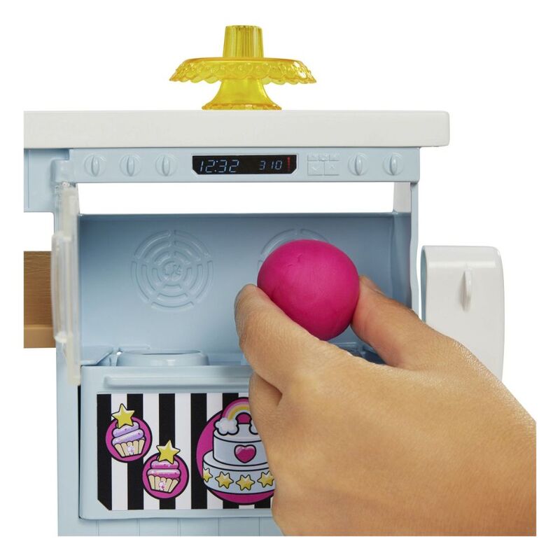 Explore the experience of running a bakery with the Barbie® Bakery Playset! Kids love baked treats and with this playset they can run a bakery and make yummy cakes and other treats! The playset includes Barbie® bakery petite doll (12-inches) with cool pink hair dressed in a cute striped dress with smock. The bakery station has three play areas to bake, decorate and display plus comes with 20+ accessories for storytelling fun. Kids can use two kinds of dough (pink or blue) and put it in the oven, pull the lever and watch the cakes rise for cake-making fun! They can then decorate the cake on the pedestal and use cake decorating accessories and toppers to design the cake exterior. The playset includes bakery station, Barbie® 12-inch doll, 2 dough containers, piping bag stamper, spatula, decorations, toppers, cupcake tin, cookie plate and more. Barbie® doll can hold some of the accessories for even more realistic play fun. Doll cannot stand alone. Colors and decorations may vary. Makes a great gift for ages 3 years old and up.