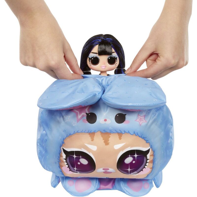 This outrageously fun, experiential reveal is bursting with layers of surprises, perfect for endless imaginative and storytelling play for kids. Discover what’s inside by first tearing the zipper at the bottom of the packaging and lifting the outer pink shell to reveal a mystery wrapping paper, kicking off the first stage of the inflating process! Watch as the paper grows bigger and fuller and once completely inflated, rip open the paper to discover your charming blue bunny costume! But wait, the surprise doesn’t stop there! Undo the Velcro from the back of the bunny’s head to unveil your gorgeous Tweens Aya Cherry doll hidden inside!