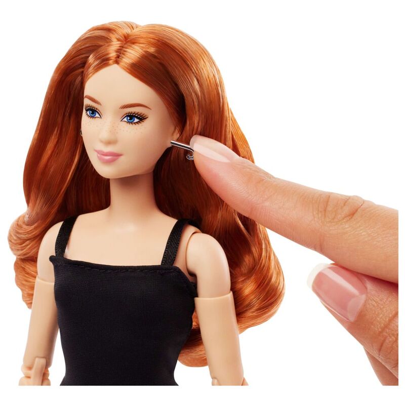 - Barbie Basics Model 04 doll is elegantly effortless in a long-midi LBD with a thigh-high slit and platform shoes. Her red curls cascade to reveal dainty, silvery hoop earrings.