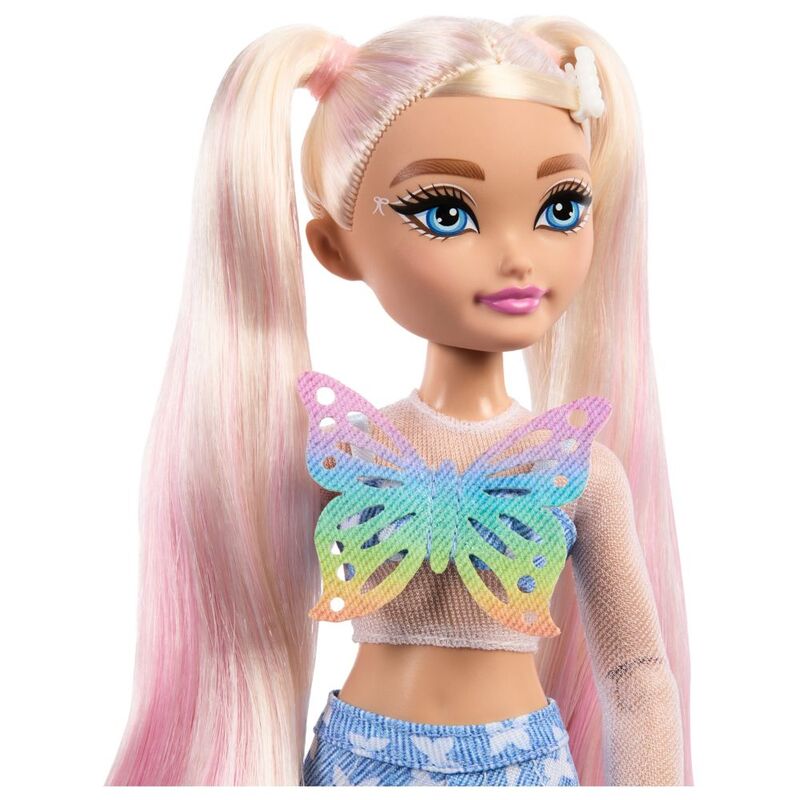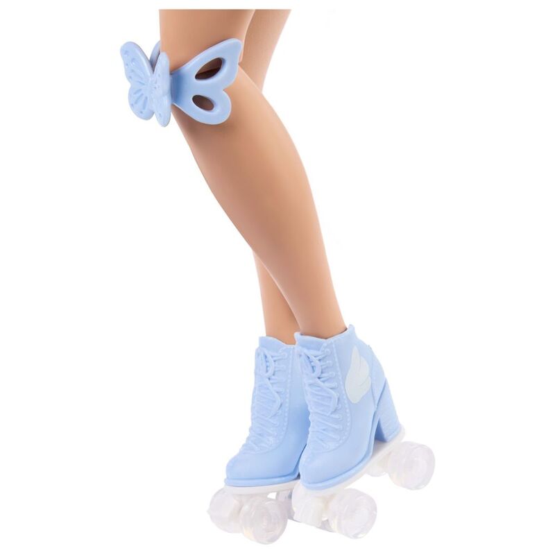 - The doll is posable and is wearing removable fashions, like her sparkle butterfly top layered over a sheer white long sleeve, butterfly-patterned denim shorts with a peplum hem, and her matching blue roller skates with wing details!