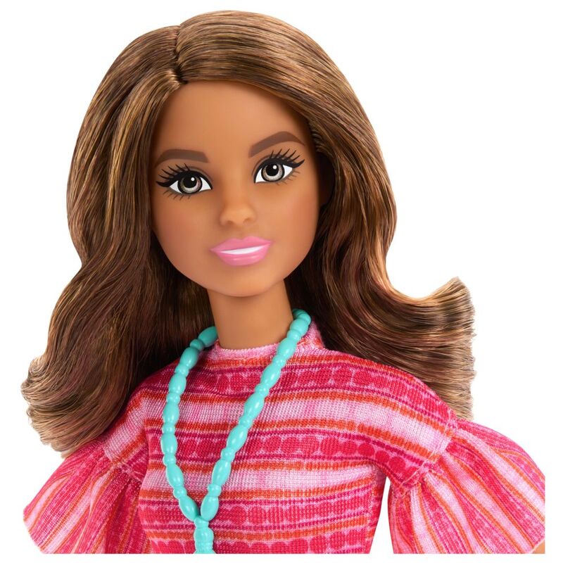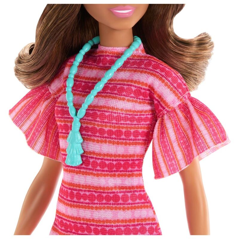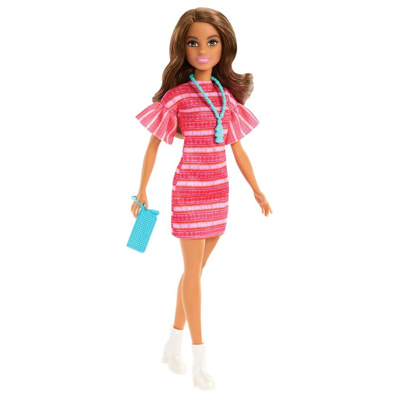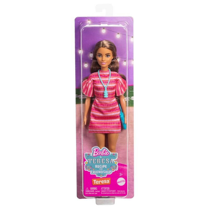Imaginations can cook up all kinds of stories with Teresa doll inspired by the movie Barbie and Teresa Recipe for Friendship. The fashion doll brings the character to life wearing her iconic pink patterned dress with white booties. Two bright blue fashion accessories include a clutch purse and a tassel necklace resembling her piece seen onscreen. Kids and fans ages 3 years and older will love recreating scenes and making up new recipes for adventure! Doll cannot stand alone. Colors and decorations may vary.