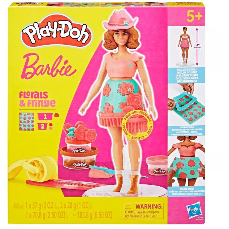 Create super cute country styles with the Florals and Fringe set! It's easy and fun to make Play-Doh Barbie doll clothing with this arts and crafts kit. Just place the doll on the stand, use the Play-Doh Pattern sheet and cutters to cut Barbie outfits, and dress her up in the most creative ways imaginable. Give her different Play-Doh hairstyles with the hair mold or kids can make their own by hand. Add Barbie doll accessories like a hat and boots to complete her look. Keep the imaginative play going with 3 cans of Play-Doh modeling compound to add even more details. Give a fabulously fashionable gift for kids who love Barbie playsets and Play-Doh toys!