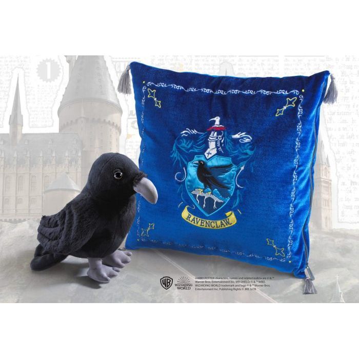 Measuring approximately 34cms square, this embroidered Ravenclaw house crest cushion contains a plush of the Ravenclaw raven mascot as featured in the Harry Potter films.