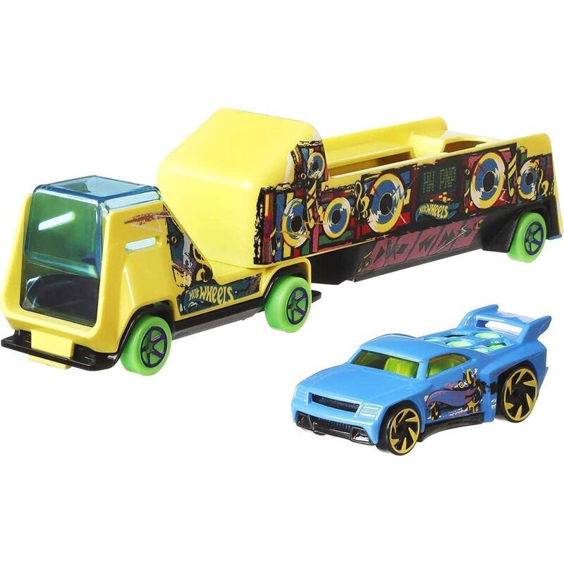 These cool Hot Wheels hauling rigs with car sets deliver inspiring ways to play -push around, load and go or hit the track for racing thrills! Each rig comes with a sports car and features big action fun and dynamic detailing. There are many radical rig models to choose from, so pick your favorite then load up and hit the road for new, powerful adventures! Each sold separately, subject to availability. Colors and decorations may vary.