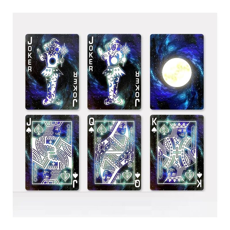 Bicycle® Stargazer New Moon playing cards bring the glow of our moon to your next card game or collection! The tuck case shines with silver foil and the unique card back features the second brightest object of the celestial sky. The card faces feature custom pips and contrasting suits to aid playability.