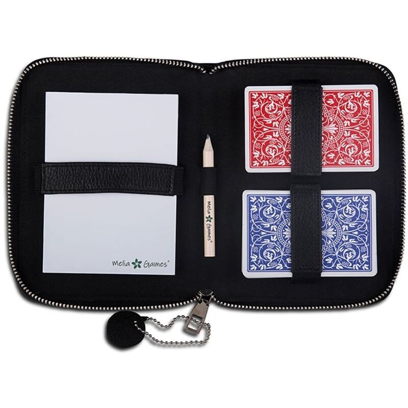 The handmade zip case has been crafted in sustainably-certified genuine full-grain leather. The zip case houses 2 decks of playing cards, perfect for rummy, canasta, bridge and more, a notepad and pencil for score keeping.