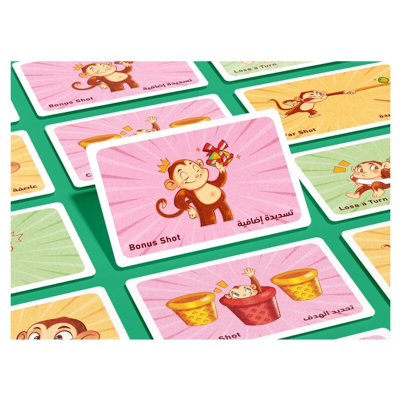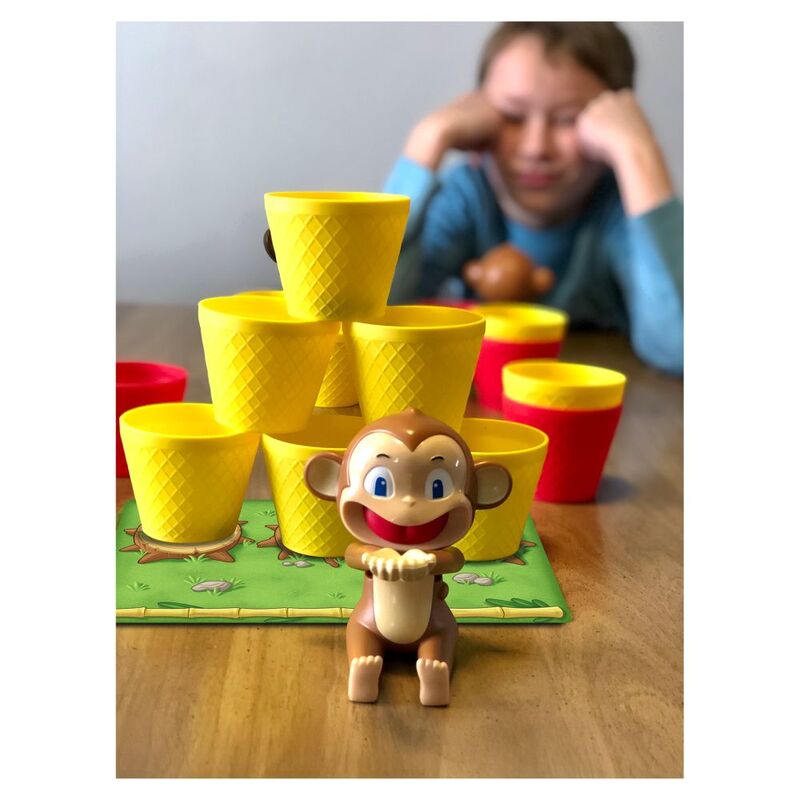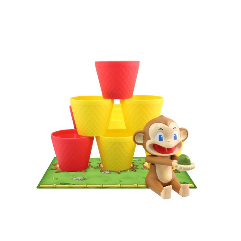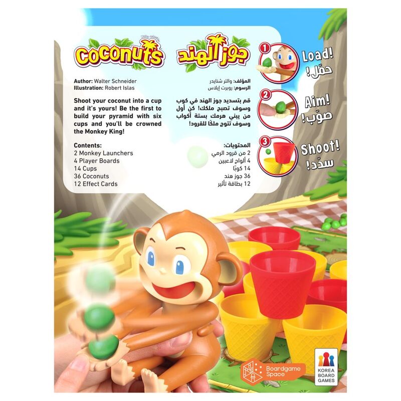 In this game, players launch coconuts toward a field of cups in the middle of the playing area. Land in a cup, and you get to stack it on your player board; land in a cup on someone else's board, and you get to move it to yours! by playing special "Magic Cards", you can force opponents to shoot blind, take long shots, or otherwise block their efforts to cup a coconut. Whoever is first to complete a pyramid of six cups on their player board, wins!