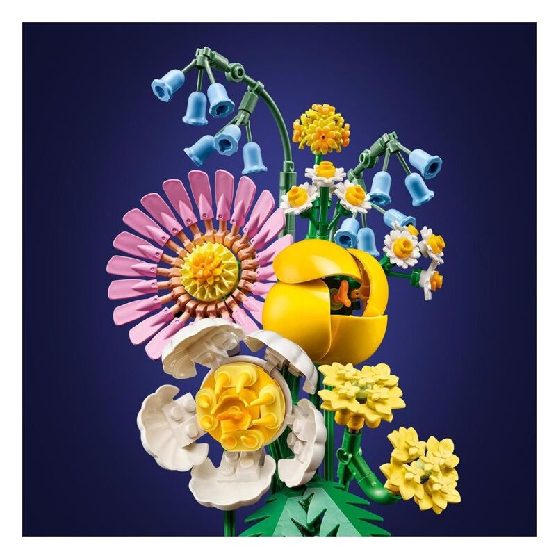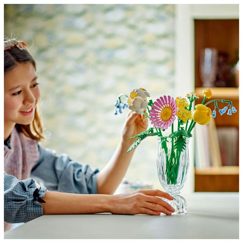 - • LEGO® flowers – The bouquet blooms with 7 species of spring flowers in pastel shades, including Billy buttons, bluebells, Cleopatra ferns, yellow yarrows, a gerbera, a peony and a tulip