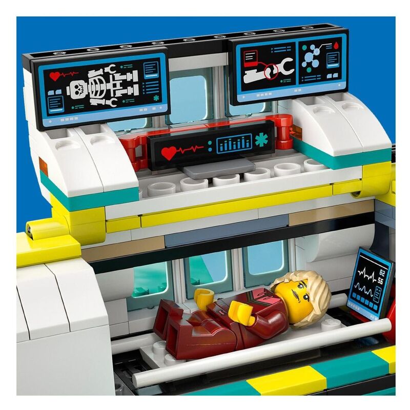 - • Minifigure accessories – This playset comes with toy first-aid accessories including a stretcher, medical bag, syringe and a water bottle