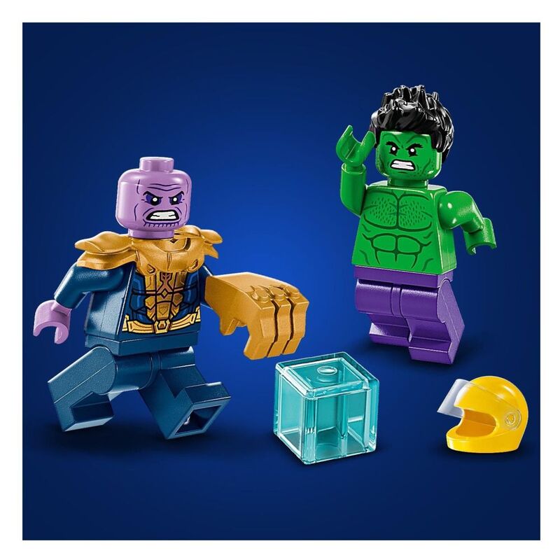 - • LEGO® ǀ Marvel minifigures – The build-and-play toy includes a Hulk minifigure with a removable helmet and a Thanos minifigure with a Tesseract and Infinity Gauntlet