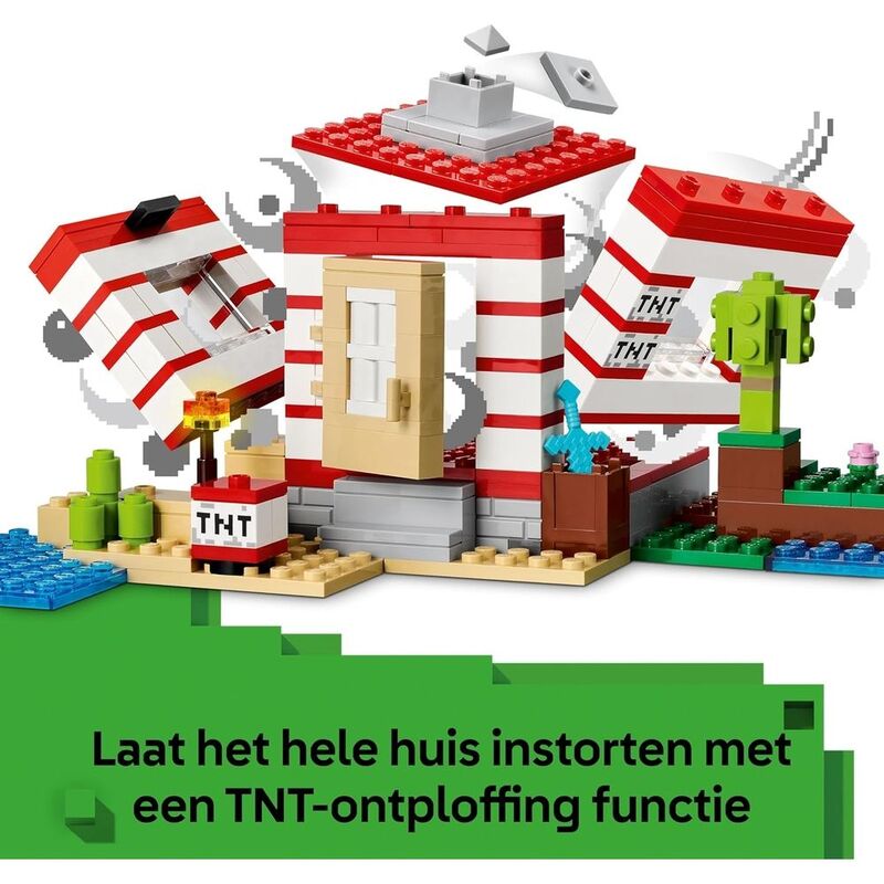 The buildable house is set in the Minecraft jungle biome and looks like a large-scale version of the game's iconic TNT element. A switch on the side lets kids trigger an exploding TNT function, which collapses the entire house. When the dust settles, kids can rebuild the house so it's ready for their next adventure. Steve, Creeper and zombie minifigures inspire imaginative play and battle action. Authentic LEGO Minecraft accessories include a boat, fishing rod, fish, parrot and jungle foliage.