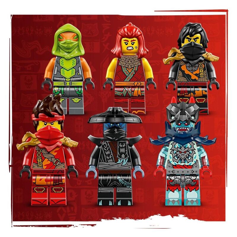 This LEGO® vehicle playset features 6 minifigures: Kai, Wyldfyre and, for the first time, Frak, each with 2 golden katana sword accessories, Cole with a translucent reveal blade accessory and Nokt and a Spectral Dragonian Scout, who each have a sword accessory, plus a glider vehicle toy and a creature model. The villainous duo also have a banner with a secret message that can only be revealed by Cole’s translucent reveal blade.