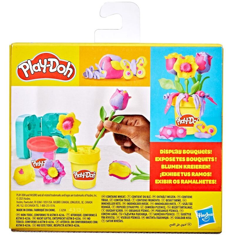 The creation process is intuitive and satisfying: simply insert colorful Play-Doh and a stem into a special book-shaped mold, close it, and then open it to reveal a finished tulip or daffodil! The finished flowers can be placed on one of three stems and placed on a stand -which easily attaches to an empty Play-Doh can for an attractive display.
