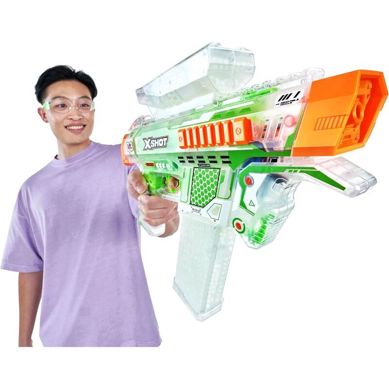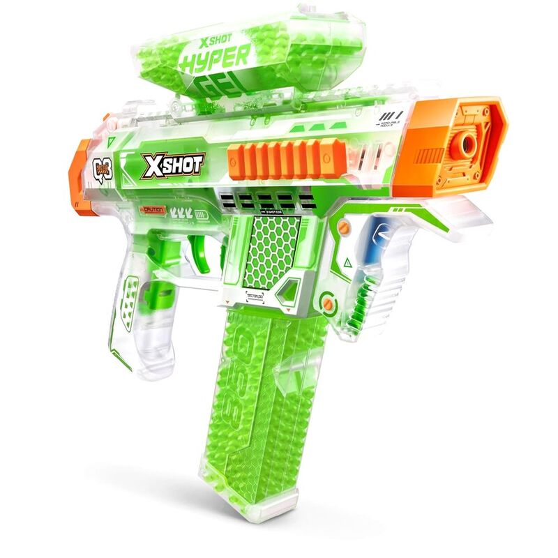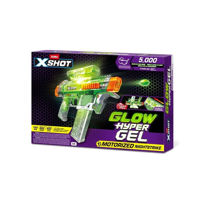It's time to get hyped up with XSHOT Hyper Gel Glow in the Dark! XSHOT Hyper Gel Glow In The Dark NightStrike can blast Hyper Gel Pellets at 170 feet per second with its motorized fully and semi automatic modes. Battle all night long with the NightStike's Glow in the Dark technology, and Glow in the Dark Gel Pellets, which will push your blaster battles to the NEXT LEVEL! The NightStrike has a 600 Pellet capacity hopper, when you run out of Gel Pellets simply flip your blaster to reload from the 850 Pellet capacity mag. This motorized Gel Blaster comes with a rechargeable battery. Stocked with 5,000 Glow in the Dark Hyper Gel Pellets and protective eyewear, just add water to start the ultimate Gel Blaster battle!
