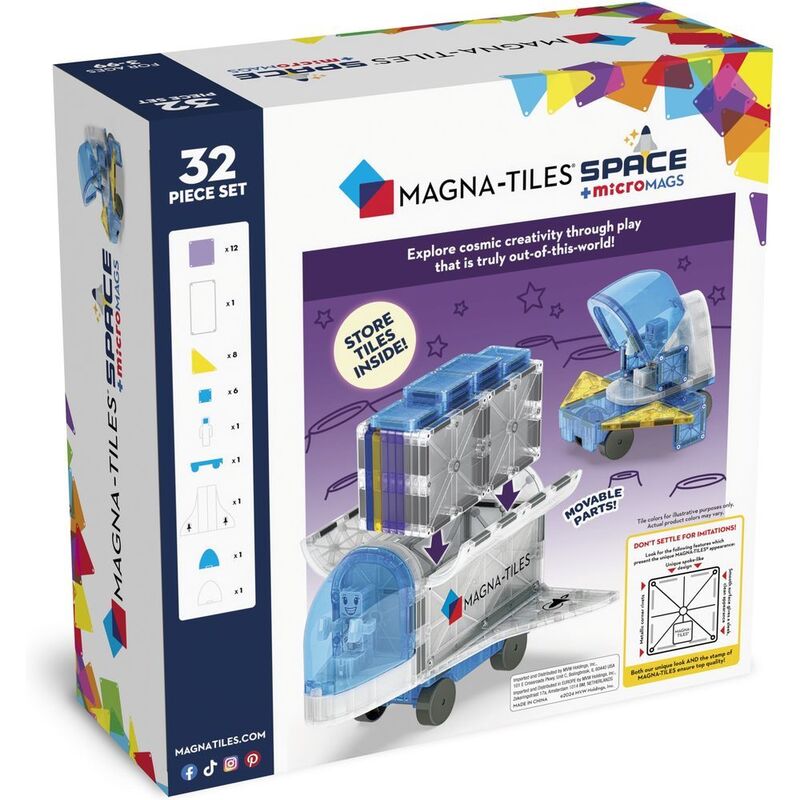 Interstellar imaginations are over the moon with the MAGNA-TILES® Space set! Blast off into cosmic creativity and discover new ways to play with the one-of-a-kind Space Shuttle that conveniently stores all pieces after play.  Enjoy the thrills of learning through play at light speed, with this STEAM-centric space adventure. Future astronauts everywhere agree: MAGNA-TILES® Space is truly an out-of-this-world building experience!Includes first-of-its-kind Shuttle with ample storage for all Space set pieces.Encourages children to learn through play, exploring cause and effect and other logic principles, while fostering the development of hand-eye coordination and fine motor skills.Makes a great gift for space-loving kids ages 3+.Add MAGNA-TILES® Classic sets to the fun and build out an entire space station!