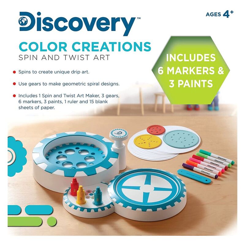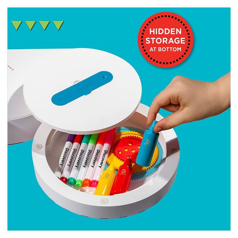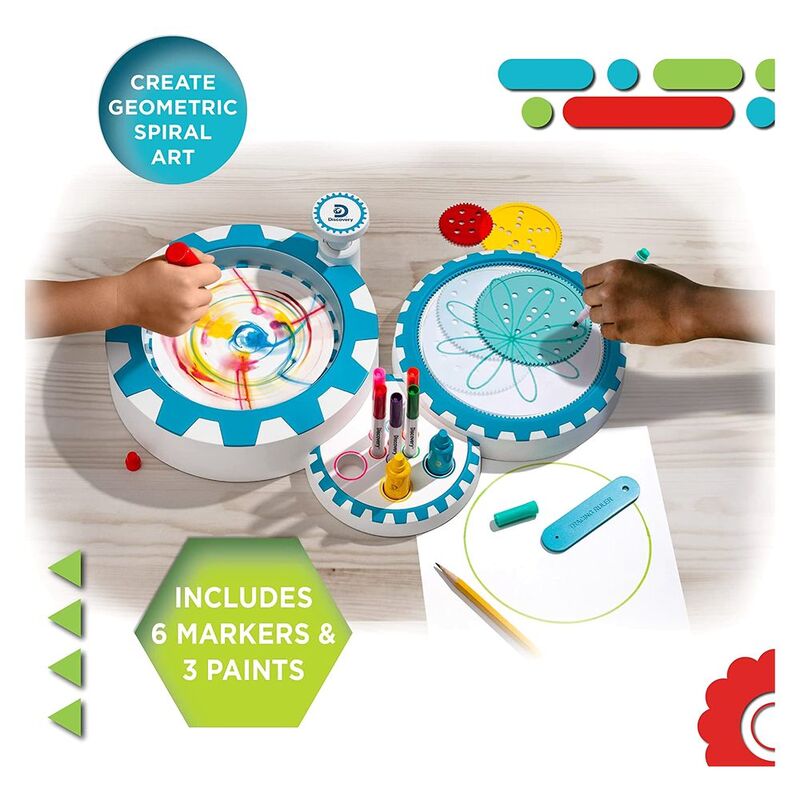 Create lovely works of art that everyone can do! Capture their imagination with this unique swirl art machine by dripping paint onto the machine as it spins to create vibrant displays of shapes and colors! Use the 3 included gears to create different shapes and sizes! This complete kit includes all the parts you need to start creating right out of the box. Best of all, the components and art supplies all store neatly in the hidden compartment on the bottom.