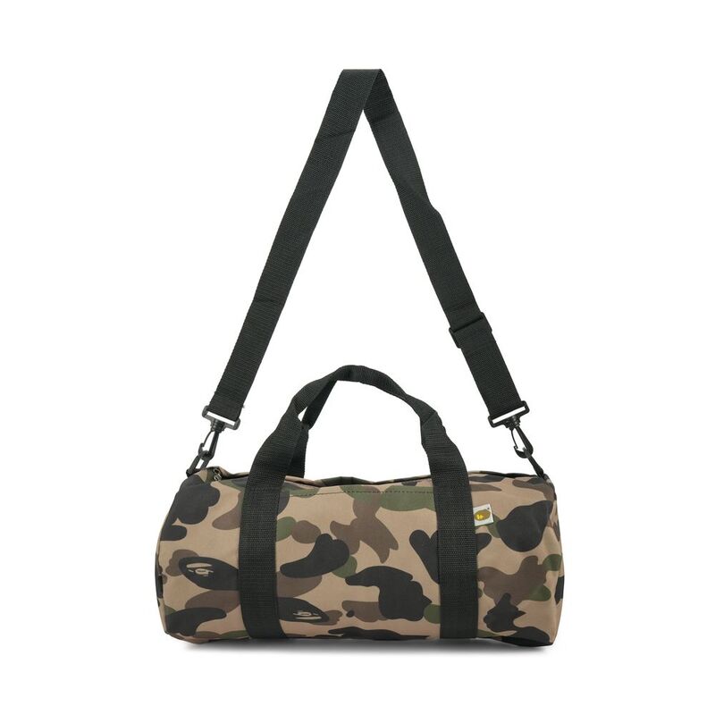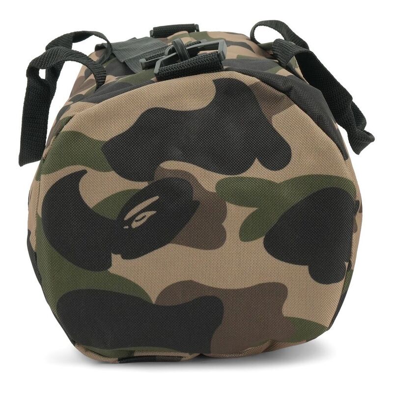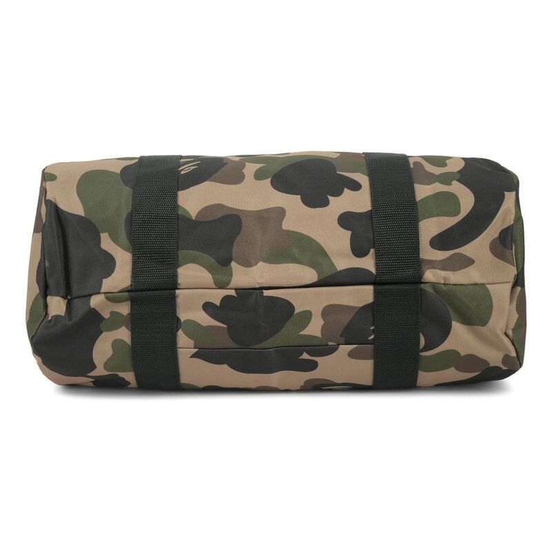 This BAPE Dark Green Camo Mini Duffle Bag is crafted from durable materials, featuring a timeless camouflage print in shades of green, with the iconic BAPE logo on a small tag near the top. It offers a blend of style and practicality, offering a spacious main compartment, easily accessible through a wide zippered opening. Black canvas straps offer comfortable carrying options, with both short top handles and an adjustable, detachable shoulder strap for added convenience.