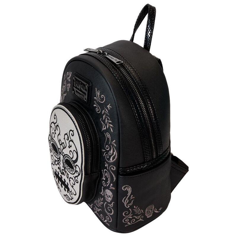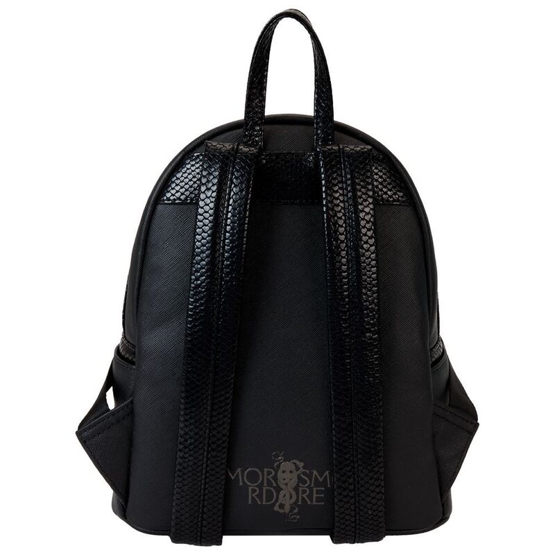 Heading to Malfoy Manor for an important meeting? Do so in style with our Harry Potter™ Death Eater Mini Backpack. This wickedly fashionable accessory features an oval-shaped front pocket with a Death Eater’s face that comes to life in applique, silver metallic vegan leather, and embroidered detail. Elegant flourishes appear on the main part of the backpack, just behind the front pocket, and they continue on the side panels. On one side panel, you will find the image of a serpent, and on the other, a skull. Turn the backpack around, and the incantation for conjuring up the Dark Mark appears: “Morsmordre.” Pack your potions, wand—or daily essentials—and take off on magical adventures in character.