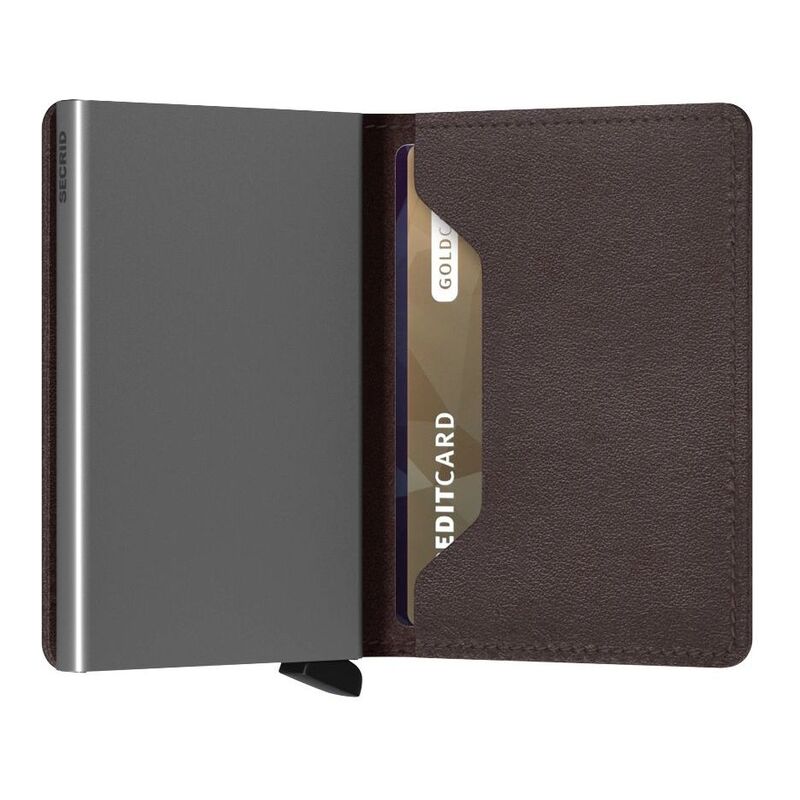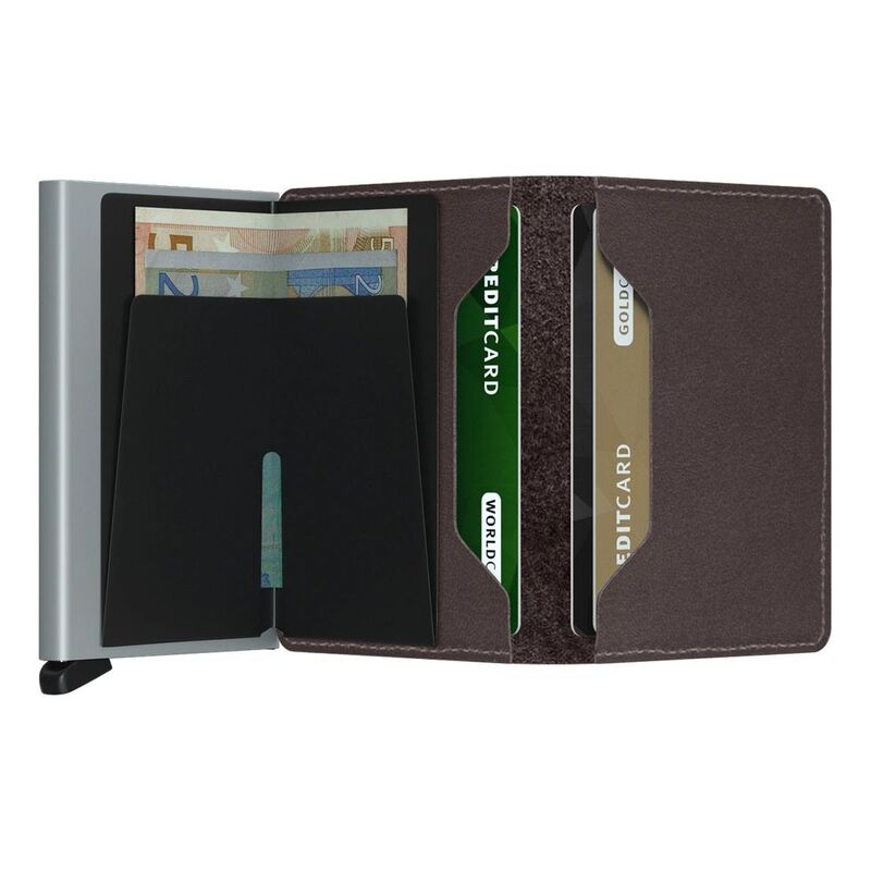 Slimwallet leather is cut wider than the leather of the Miniwallet, providing space for extra cards, bills, business cards, and receipts. The Slimwallet is less suitable for coins.