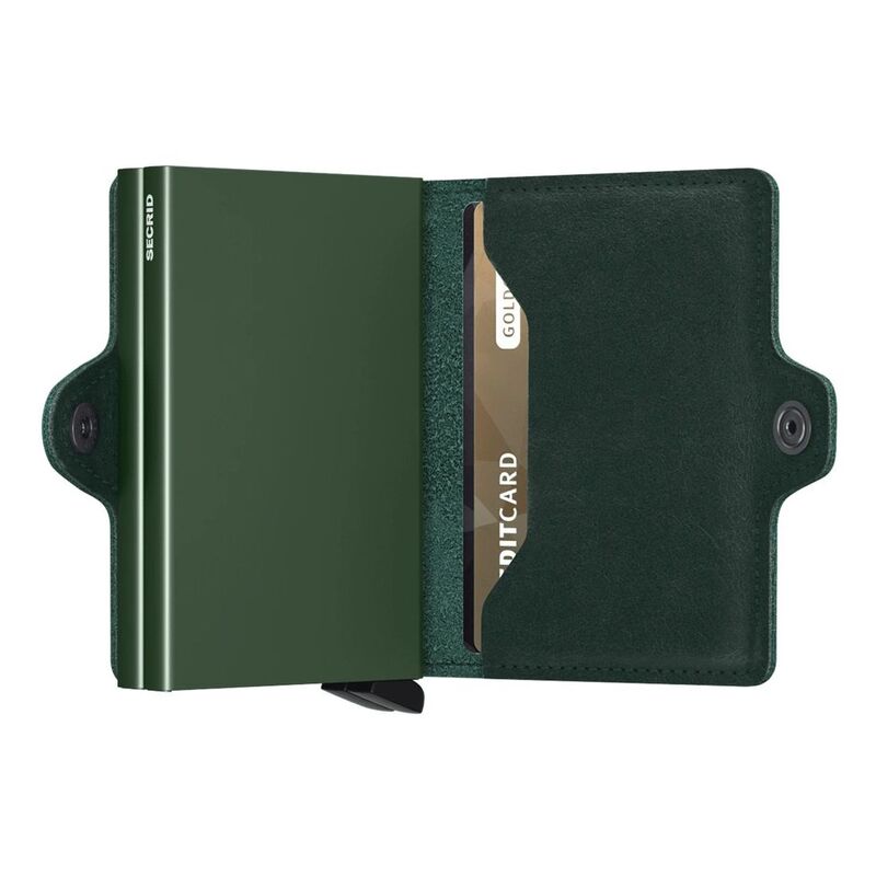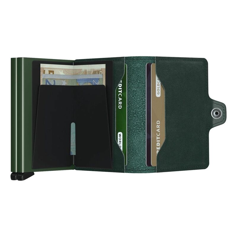 The Twinwallet consists of two Cardprotectors in a leather pouch with press stud closure. With the Twinwallet, you can securely take eight to twelve cards with you. The interior also offers space for extra cards, paper money, receipts, business cards and coins.