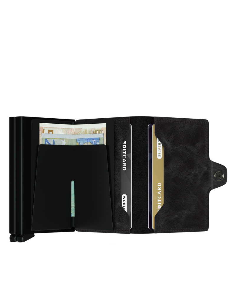 The Twinwallet consists of two Cardprotectors in a leather pouch with press stud closure. With the Twinwallet, you can securely take eight to twelve cards with you. The interior also offers space for extra cards, paper money, receipts, business cards and coins.