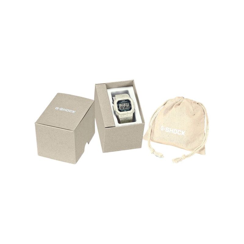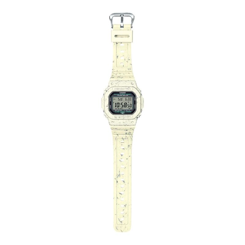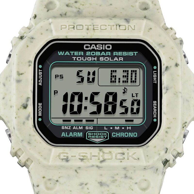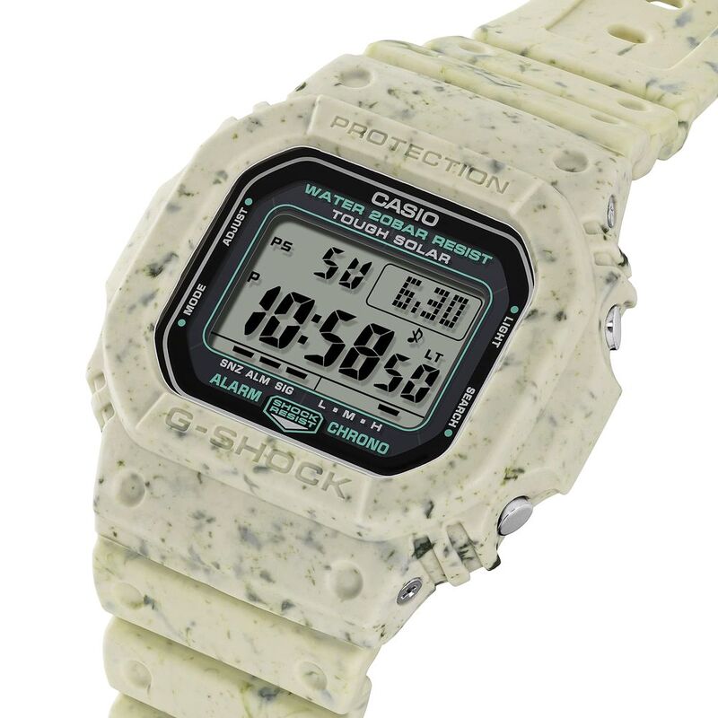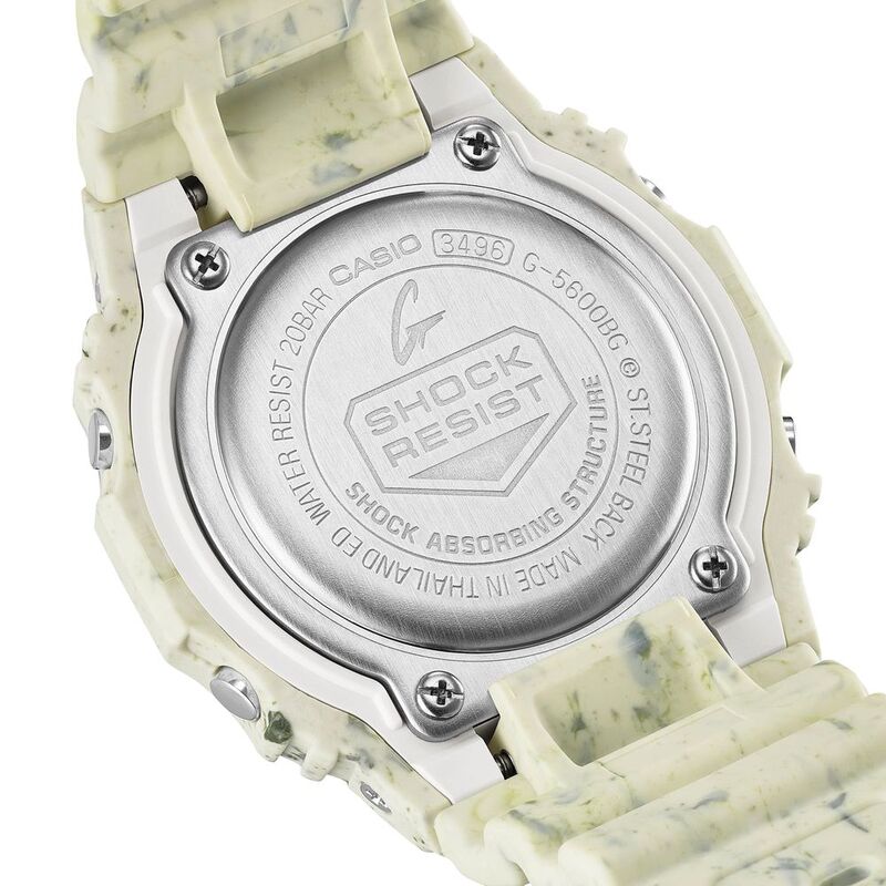 The G-5600BG-5 makes the most of resin left over from the manufacture of components for other watches. Waste resin in white and olive green is powdered and kneaded into a beige base, creating a special design with a unique, subtly colorful pattern that will take you wherever you want to go from everyday fun to fashionable occasions. Equipped with G-5600 Tough Solar, which charges the watch with even small amounts of indoor light, and a bezel and band made with recycled resin scraps, this timepiece completely manifests your commitment to help reduce environmental impact. Note: The exact color and pattern may vary from watch to watch due to the particular characteristics of the product.