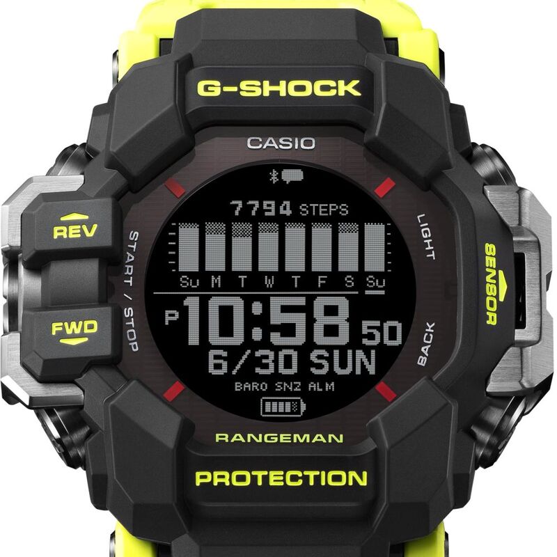 The RANGEMAN GPR-H1000RY is built with a dust, mud, and shock-resistant structure and also comes equipped with six sensors that take a myriad of measurements including heart rate, and with built-in GPS to measure location, distance, and travel speed. Keep track of your physical condition in real time during 9 different activities, including trekking.