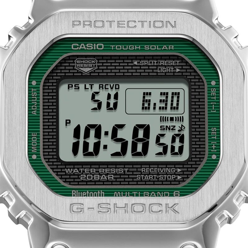 The GMW-B5000-3 inherits this legacy and carries it forward in an effortlessly refined full-metal G-SHOCK design with a silver gleam accented by an outline of fresh green.