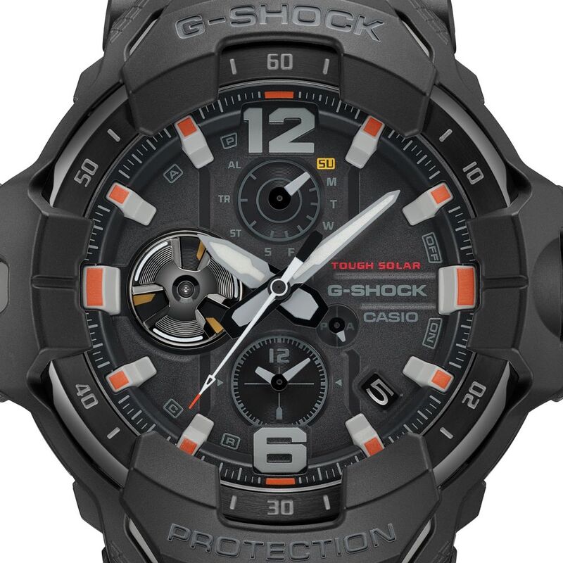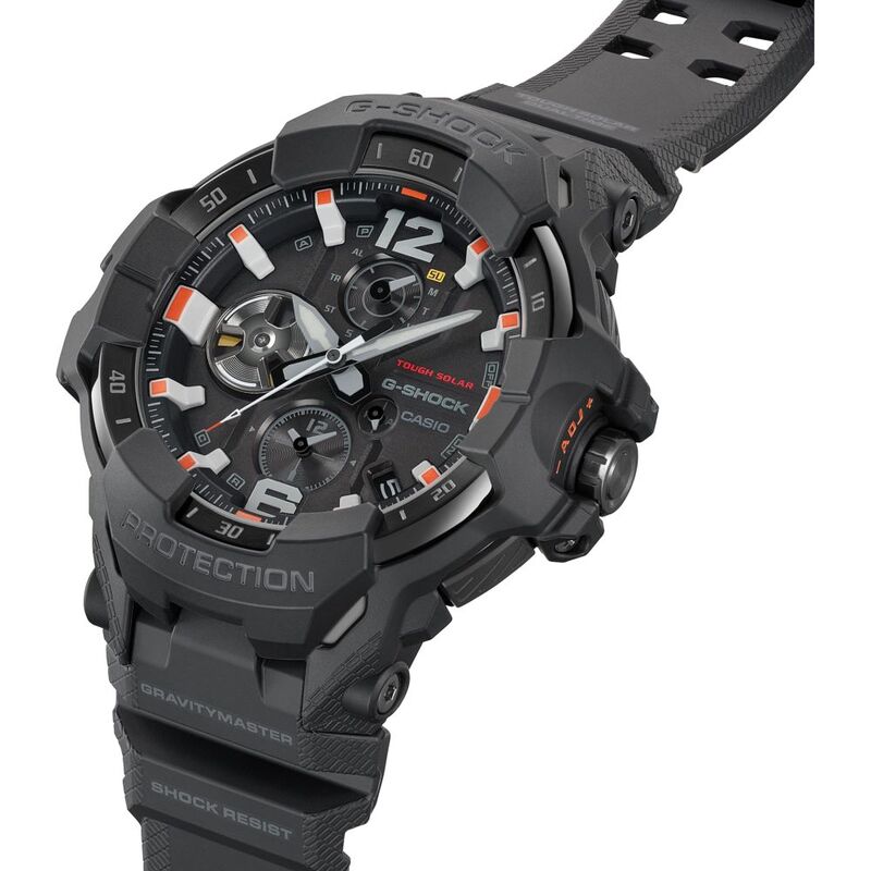 The organic form of the GRAVITYMASTER GR-B300EC is inspired by next-generation aircraft and rendered with a seamless exterior design. The Carbon Core Guard structure and wide 3D face deliver durability, readability, and a comfortable fit. Enjoy all the practical functions as well, including dual-time simultaneously showing the time in two cities, a flight log memory function for recording routes traveled, and more.