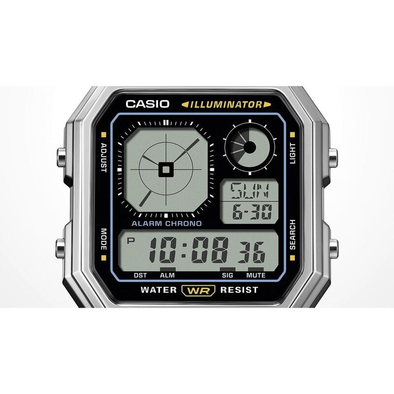 A digital watch featuring an analog-style clock display all wrapped up in the gadgety look you love.