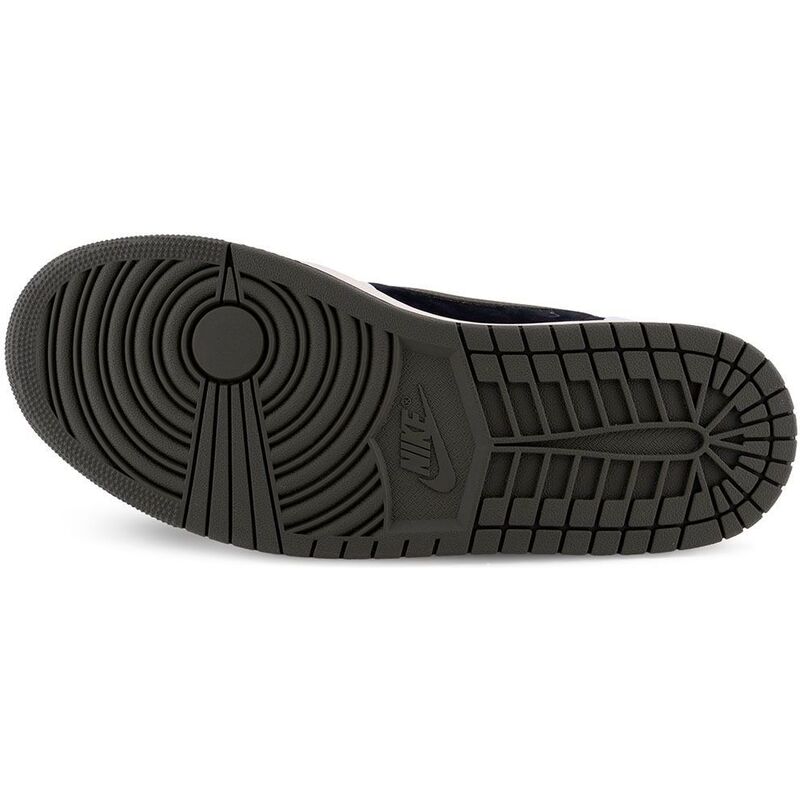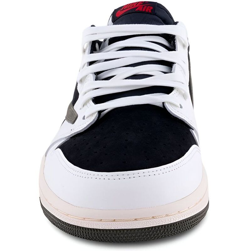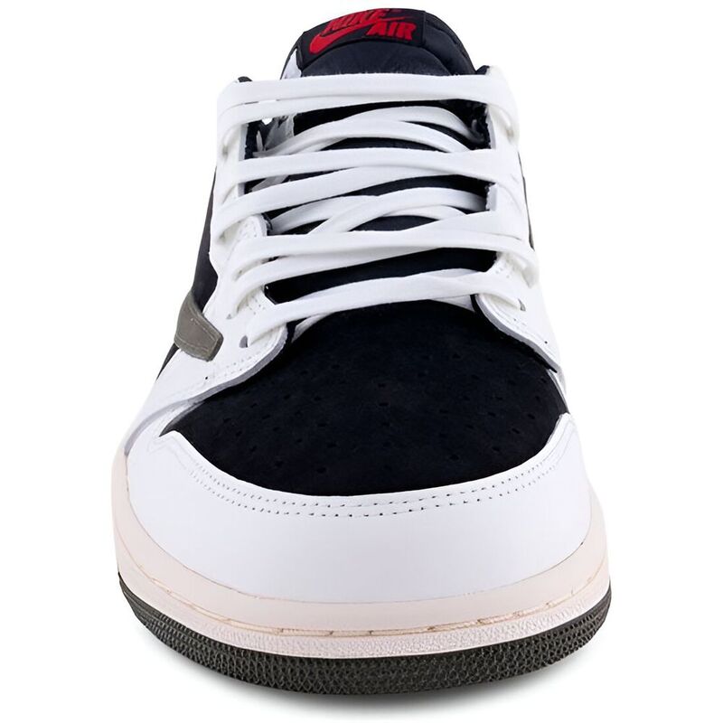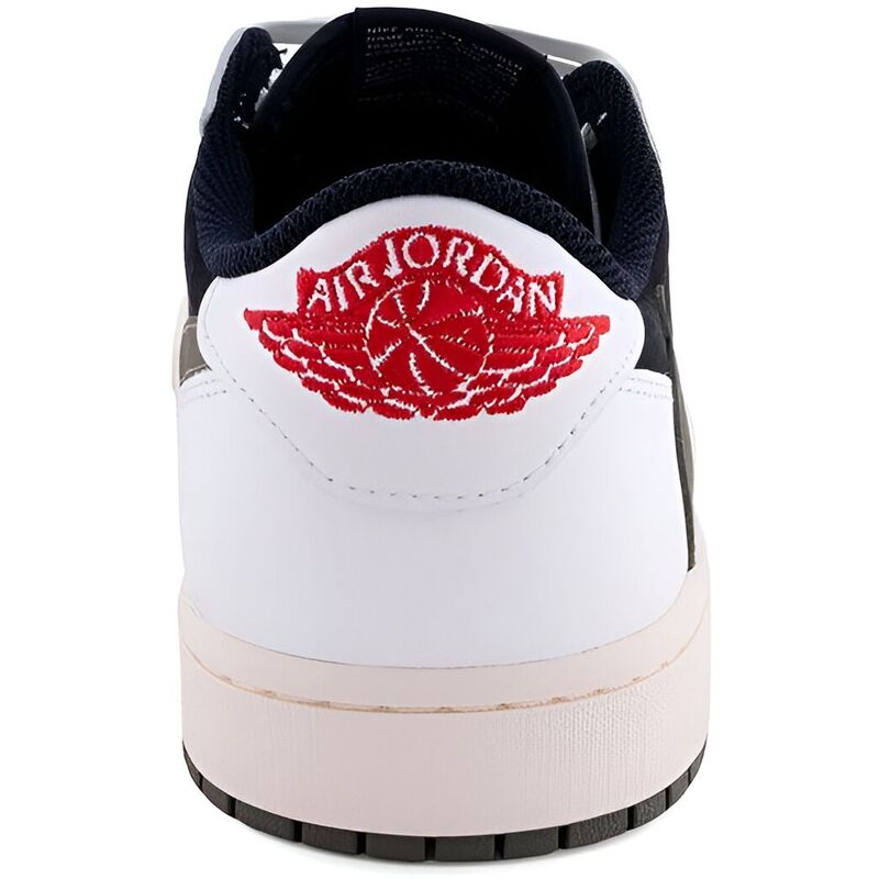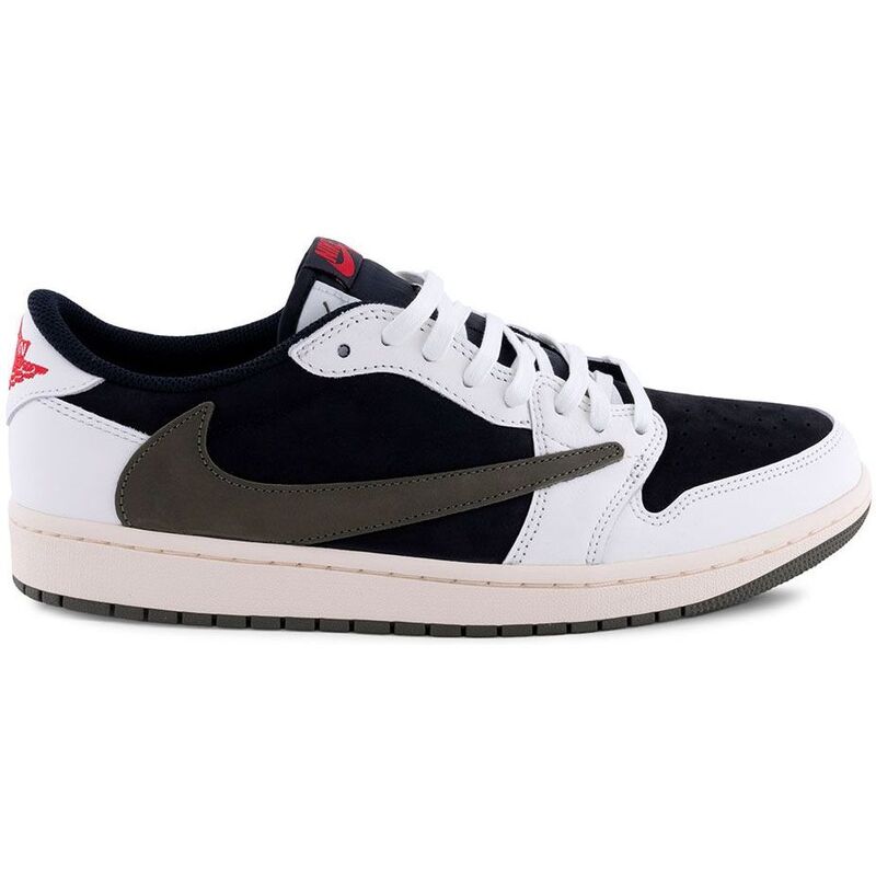 These sneakers debut the rapper’s first female-sized sneaker collaboration, featuring a black suede base with off-white leather overlays. Neutral earth tones are accented by bold crimson details, including woven Nike Air tags and mismatched Jordan and Cactus Jack branding on the heels, while the vintage off-white sidewalls complete the design with an olive-green outsole.