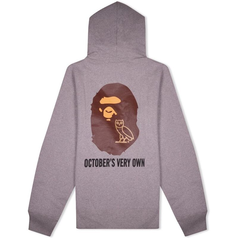 This hoodie showcases an elegant white "October's Very Own" logo on the front, complemented by a white ® logo at the bottom of the pocket. The back features the bold brown BAPE and owl logos, alongside a stylish white "October's Very Own" logo, all beautifully set against a sleek black backdrop.