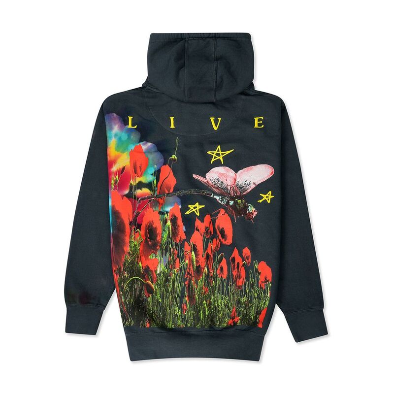 This black Travis Scott Live In Europe Hoodie showcases a vibrant, artistic design, featuring a striking graphic of red poppies on the back, with "LIVE" in yellow lettering above, accented by celestial elements. The front displays a bold, colorful tie-dye swirl, with an "A" graphis, accompanied by "ASTROWORLD EUROPE 2019" in yellow and “Wish You Were Here” in light blue.