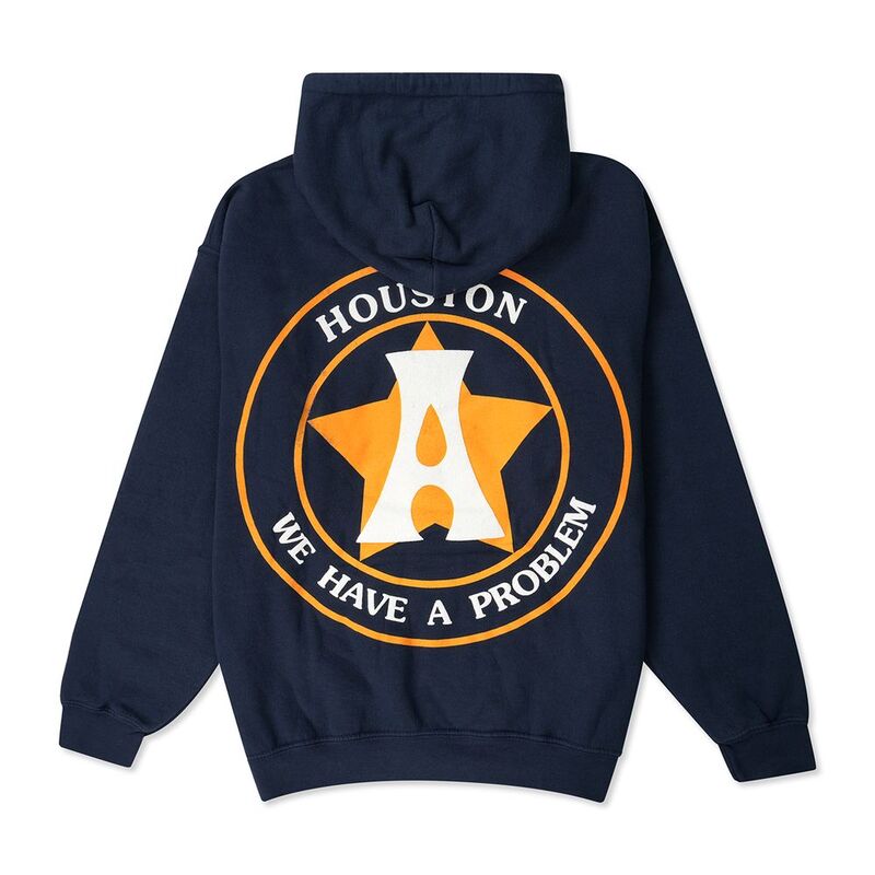 The Travis Scott Astroworld Houston Exclusive Hoodie in deep blue features a yellow Astroworld graphic, with the words “Wish You Were Here” in light blue. The back showcases the Houston Astros logo, featuring a star and circle design with an "A" printed within the star, and "Houston We Have A Problem" inside the circle, all in white and yellow against a deep blue backdrop.