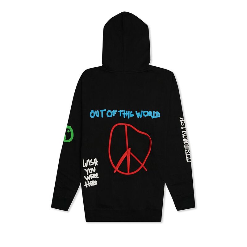 The Astroworld World Peace Hoodie, made from premium black cotton, showcases vibrant graphics in red, blue, and green. The front features the phrase "THRILLS AND CHILLS", while the iconic "ASTROWORLD" logo adorns the right sleeve. The back highlights the phrases "OUT OF THIS WORLD" and "WISH YOU WERE HERE" referring to some of Travis Scott's most famous tracks.