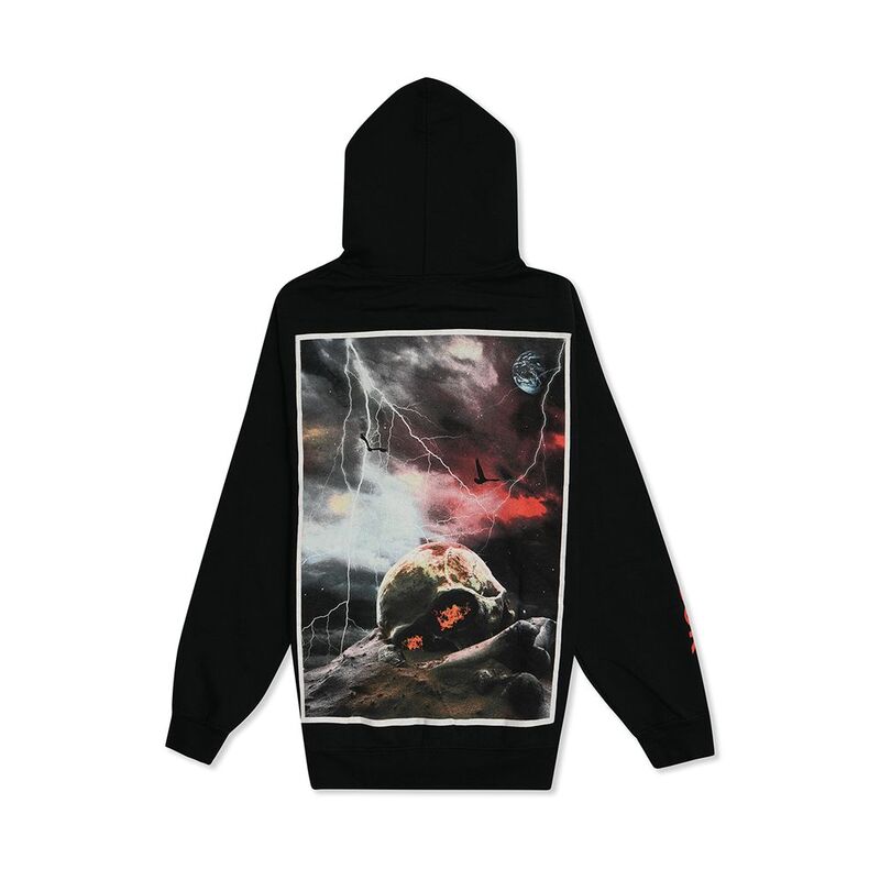 The Bird'S Eye View Fear The Flock Hoodie features a bold "BIRDS EYE VIEW TOUR" graphic across the chest, with "TRAVIS SCOTT" printed upside down along the top of the hood. The right sleeve displays the phrase "FEAR THE FLOCK" vertically in red, while the back is adorned with a dramatic graphic of a flaming skull against a stormy, celestial backdrop, evoking a sense of intensity and visual impact.