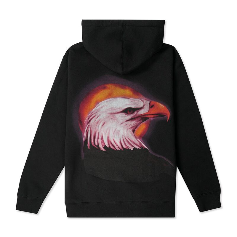 This black Travis Scott Birds In The Trap Zip Hoodie showcases a striking eagle graphic on the back, depicted with white feathers and a powerful orange-pink glow behind its head. The front features a classic zip-up style, with a minimalist design featuring the word "BIRDS" in white block letters on the chest.