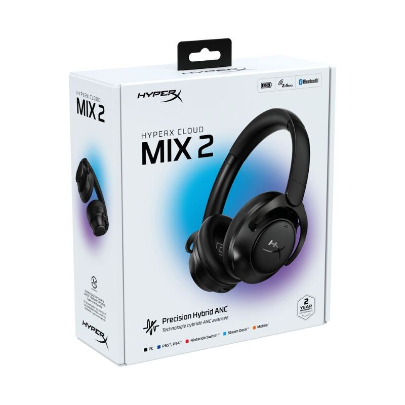HyperX Cloud MIX™2 is the next generation in the Cloud MIX™ series, redefining versatility in an over-ear design. With up to 110 hours of battery life, these headphones are perfect for music, work calls, or gaming on the go. Block out the noise of busy commutes or bustling cafes with Hybrid Active Noise Cancellation or use Ambient Sound Mode to stay aware of your surroundings. Connecting to your favorite platforms is easier than ever with dual wireless capabilities in a 2.4GHz USB-C dongle and Bluetooth® 5.3 LE Audio Technology. During your free time, experience quick and responsive performance with ultra-low latency, ideal for gaming and fast-paced activities. Plus, with the dongle cleverly stored in the earcup, Cloud MIX™2 is always ready to go!