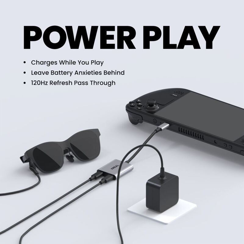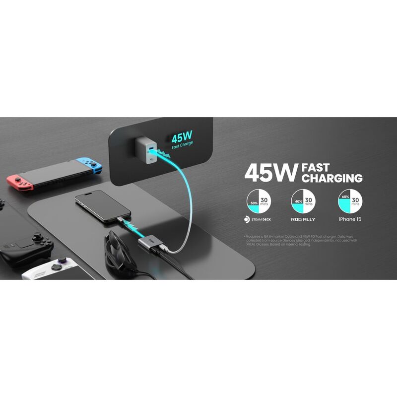 XREAL Hub, Power and Play Adapter, so you can charge AR glasses while you charge your source device, e.g. Steam Deck, ROG Ally, Switch, iPhone 15 or Android phone. 45 W fast charging
