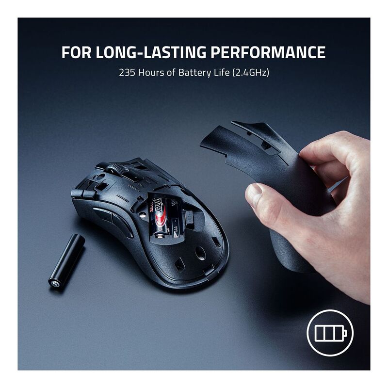 Able to run on a single AA* or AAA battery, the mouse’s hybrid battery slot gives you to option of longer battery life or lighter weight - all at an optimal position for balanced weight distribution.
