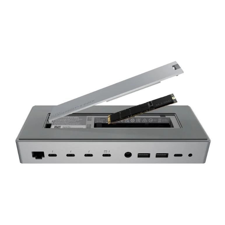 • 10 PORT DOCK WITH M.2 STORAGE SLOT — Features multiple Thunderbolt 5 ports, Gigabit Ethernet, a 3.5 mm audio combo jack, a UHS-II SD Card Slot, USB Type A 3.2 Gen 2 ports, and a storage slot for ultra-fast M.2s