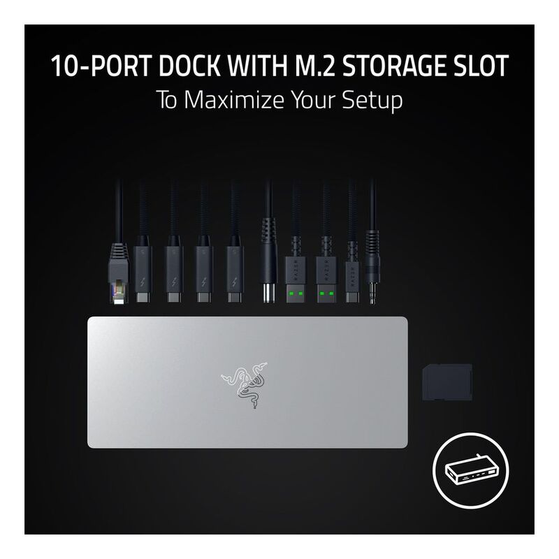 Get a quantum leap in connectivity for your desktop or laptop with the Razer Thunderbolt 5 Dock. Boasting the fastest transfer speeds, 10 ports, an M.2 storage slot, and support for triple 4K displays at 144 Hz, have all your options covered with a single, powerful Thunderbolt connection.