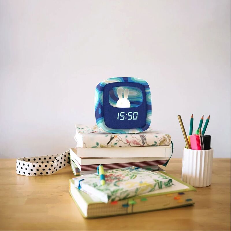 The front of the clock is made of pleasantly soft fabric, while the frame is crafted from soft-touch silicone, giving it a gentle and appealing design.