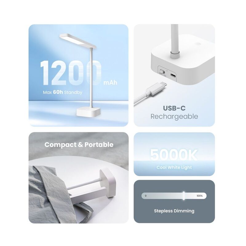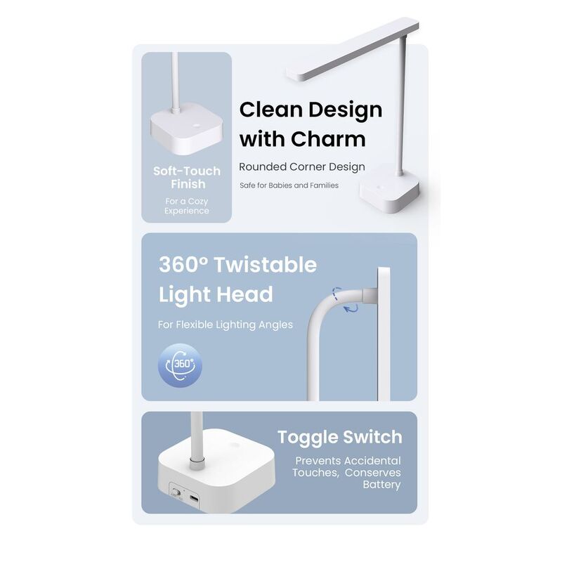 - Adjustable Lighting: 360° twistable light head, Flicker-free LED, Nightlight mode