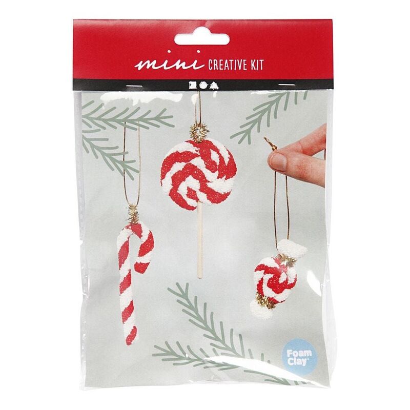 - Materials set for making a decorative hanging candy cane, caramel charm and lollipop out of Glitter Foam Clay.