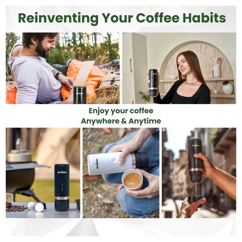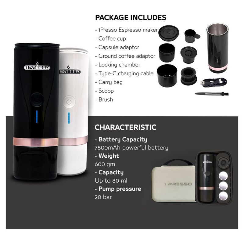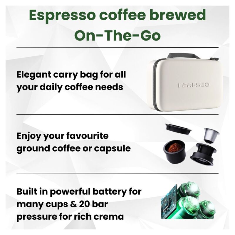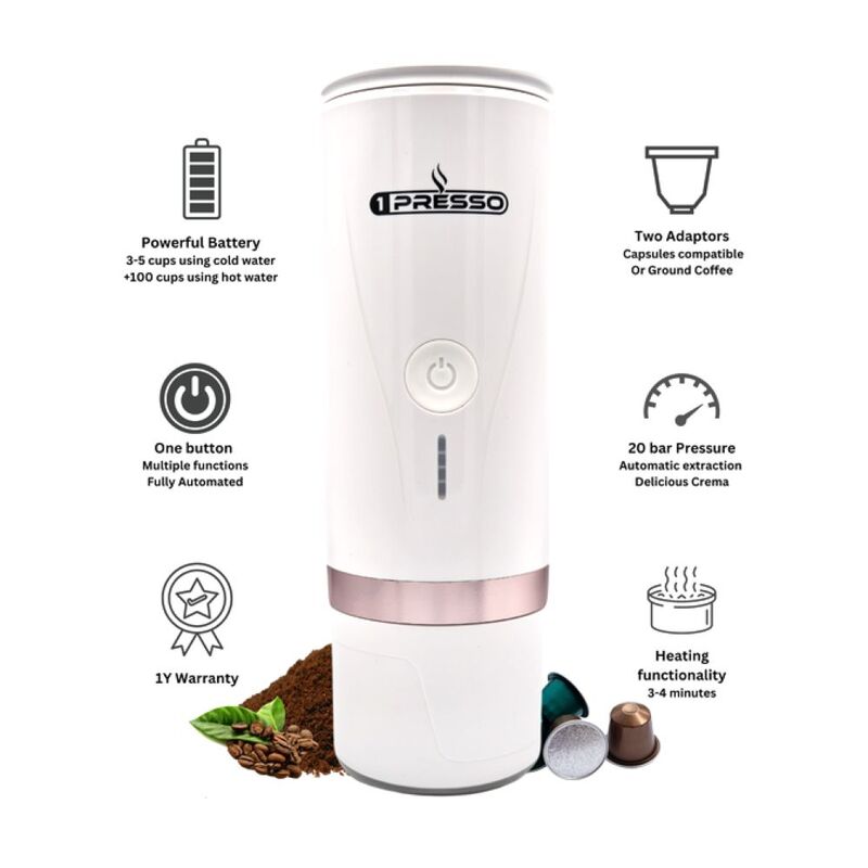 1Presso EZ Portable Espresso Coffee machine- Self heating, Compatible with capsules and coffee powder, 20 bar pump, Portable coffee maker perfect for outdoor, travel, car, office and home (White)
