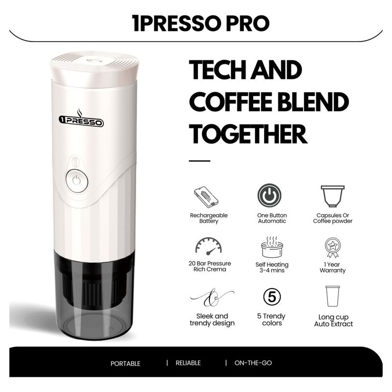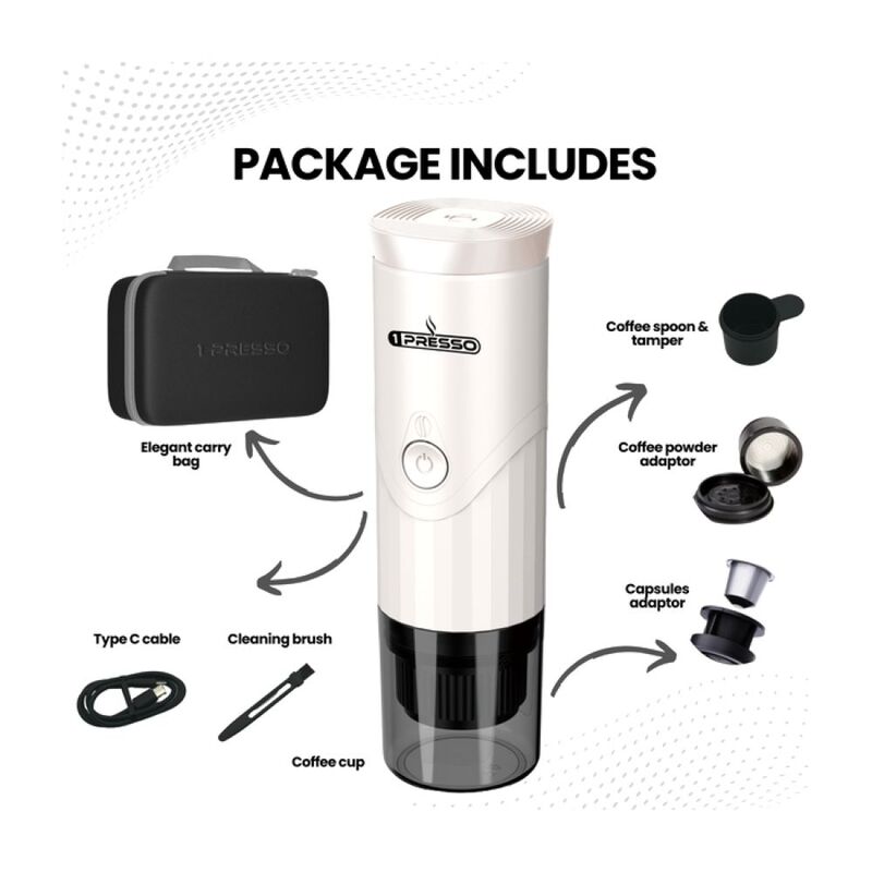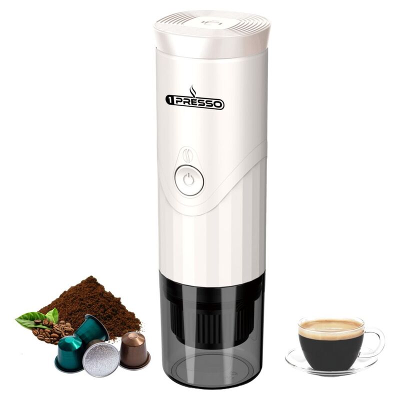 1Presso PRO Portable Automatic Espresso Coffee machine - Self heating, 20 Bar Coffee Maker, With Ground Coffee & NS capsules for Camping, Travel, Outdoors, Office and Home (White)